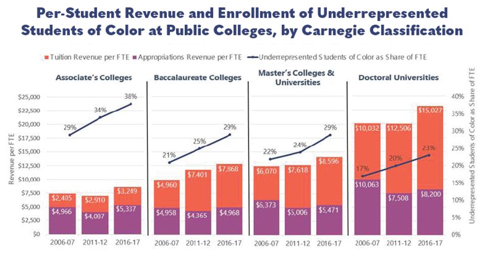 Policymakers Must Address Unequal Spending On Public Colleges | A new analysis from my colleagues at the Institute for College Access & Success (TICAS) examined how states funded colleges between 2006 and 2016, the years around the Great Recession. While community colleges now receive modestly more funding, they still receive nearly $2,900 less per student than doctoral universities. Including tuition, community colleges have just 37% of the per-student revenue of doctoral universities.